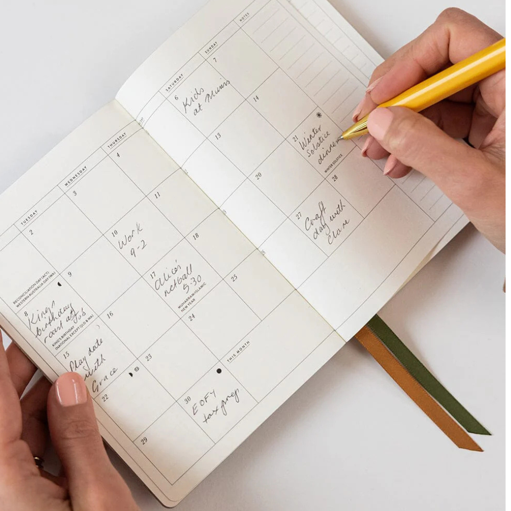 Our Pocket Planners feature lay-flat binding, where the cover isn’t attached to the spine - allowing the pages to open flat. This format typically doesn’t allow for ribbon markers, but we’ve thoughtfully designed a solution by strategically placing them within the page spine for a seamless and practical finish.