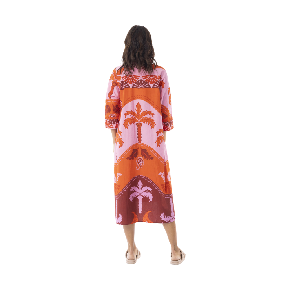 Be transported by the mysteriously elegant Celeste Orange Shirt Dress. Crafted from pure breathable cotten, this versatile piece features an oasis on the Sahara print, vibrant colour, a crisp collar, full-length button placket, and practical side pockets. Perfect for any occasion, it transitions seamlessly from day to evening, ensuring you look effortlessly chic wherever you go.