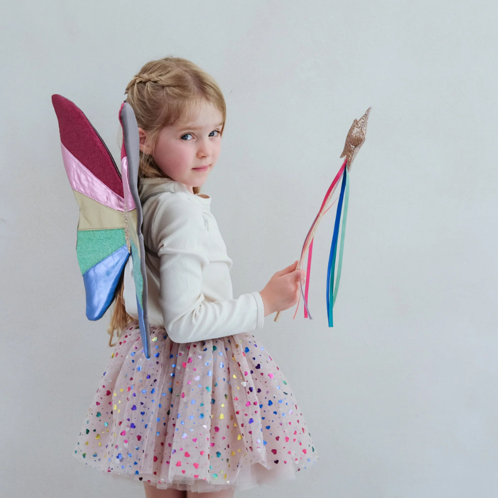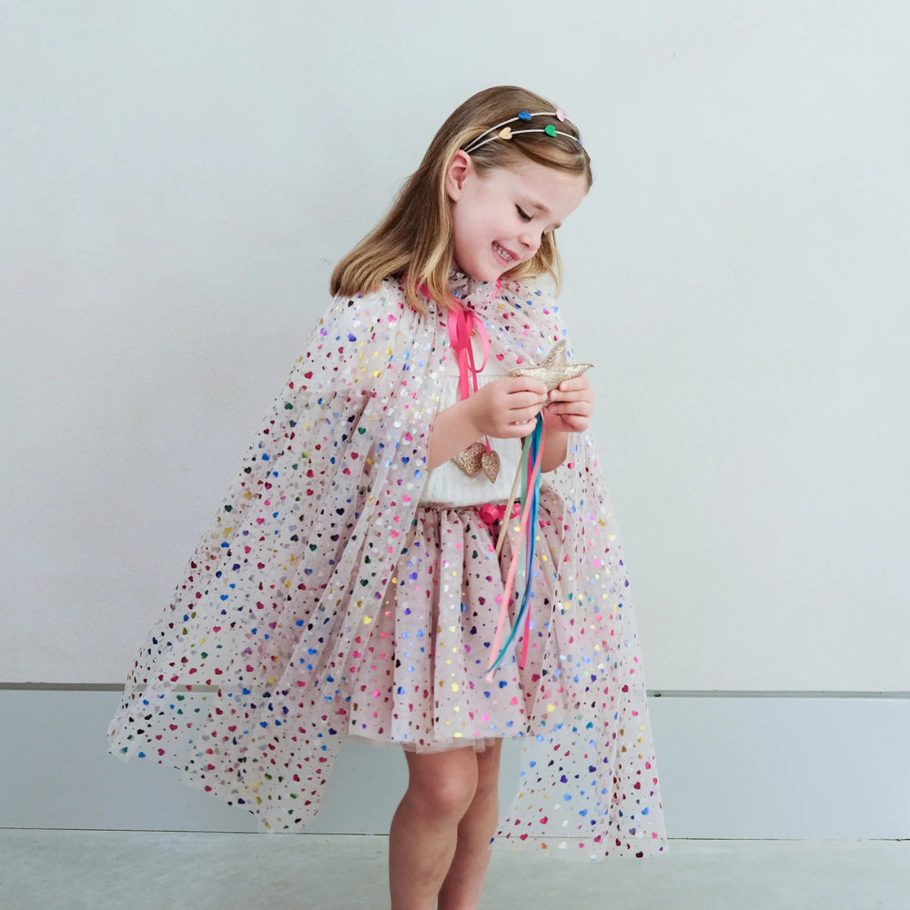 - Layers of soft neutral tulle scattered with multicoloured rainbow metallic hearts