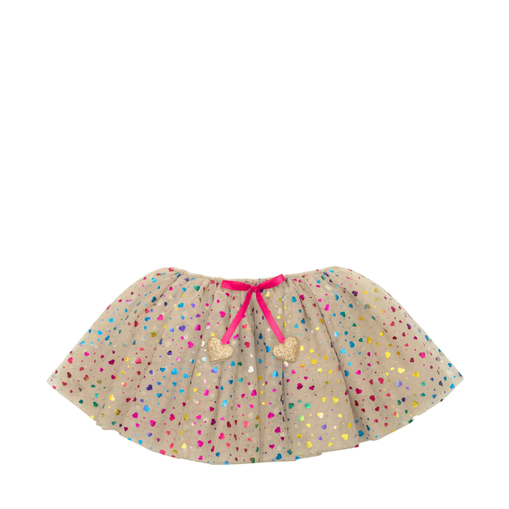 Twirl into a world of wonder with this beautiful Rainbow hearts tutu! Layers of soft tulle scattered with multicoloured hearts sure to catch the light with every spin!