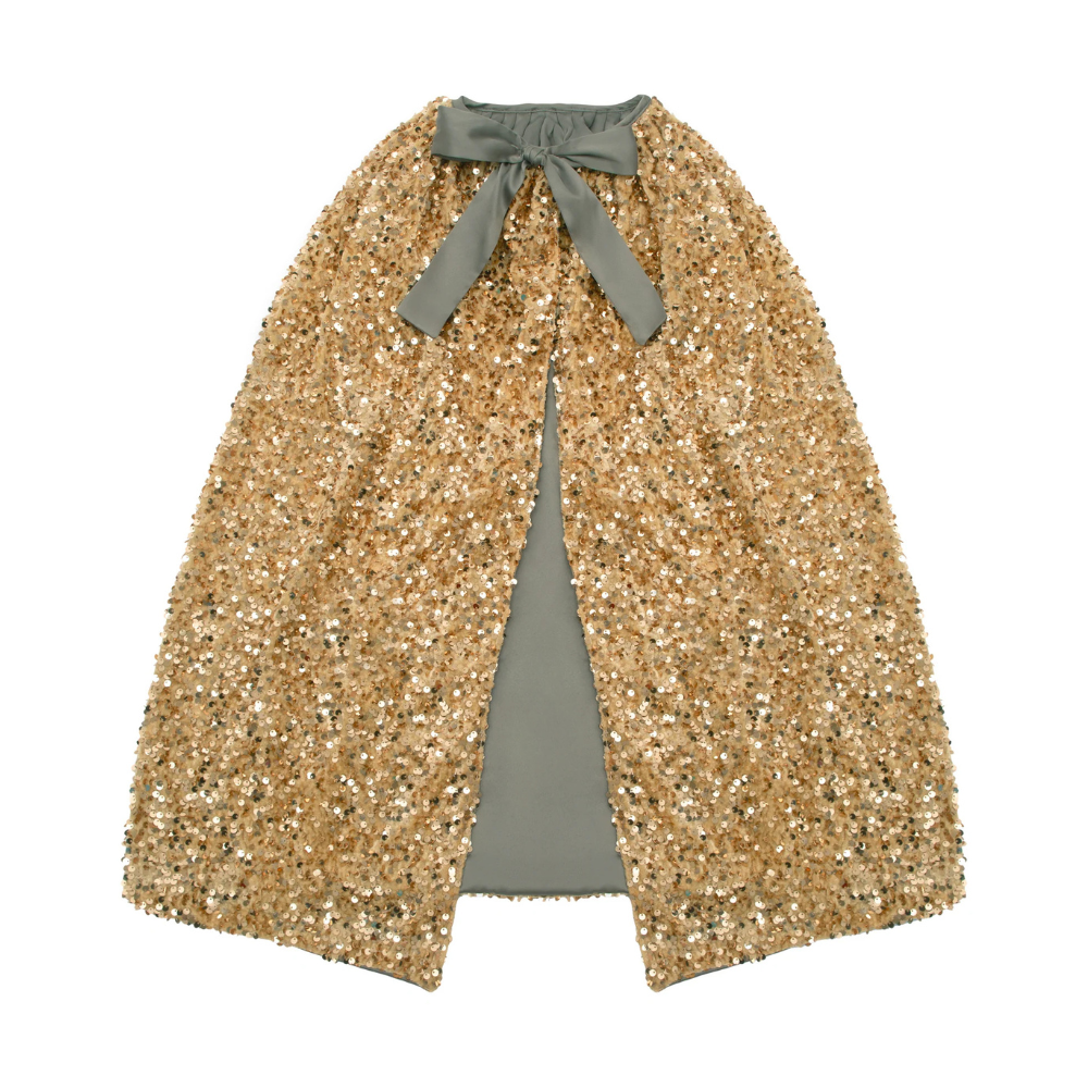 • Gold sequin embellished fabric cape with soft grey satin lining and ribbon bow with popper button closure