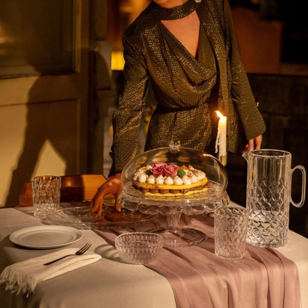 Cake stand with dome in special Bio-Based* Acrylic Crystal, a modern, renewable, organic, non-fossil material obtained from vegetable waste that’s also 100% recyclable.