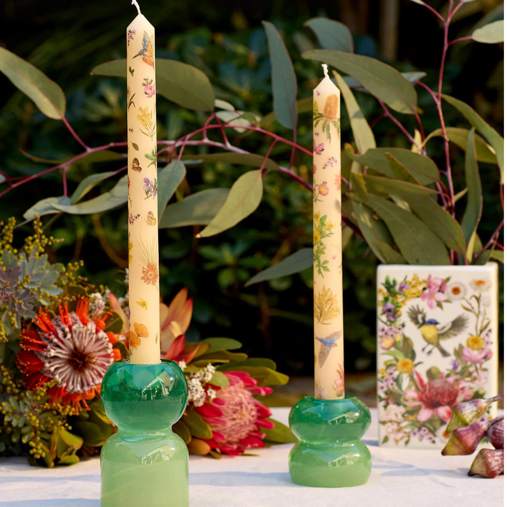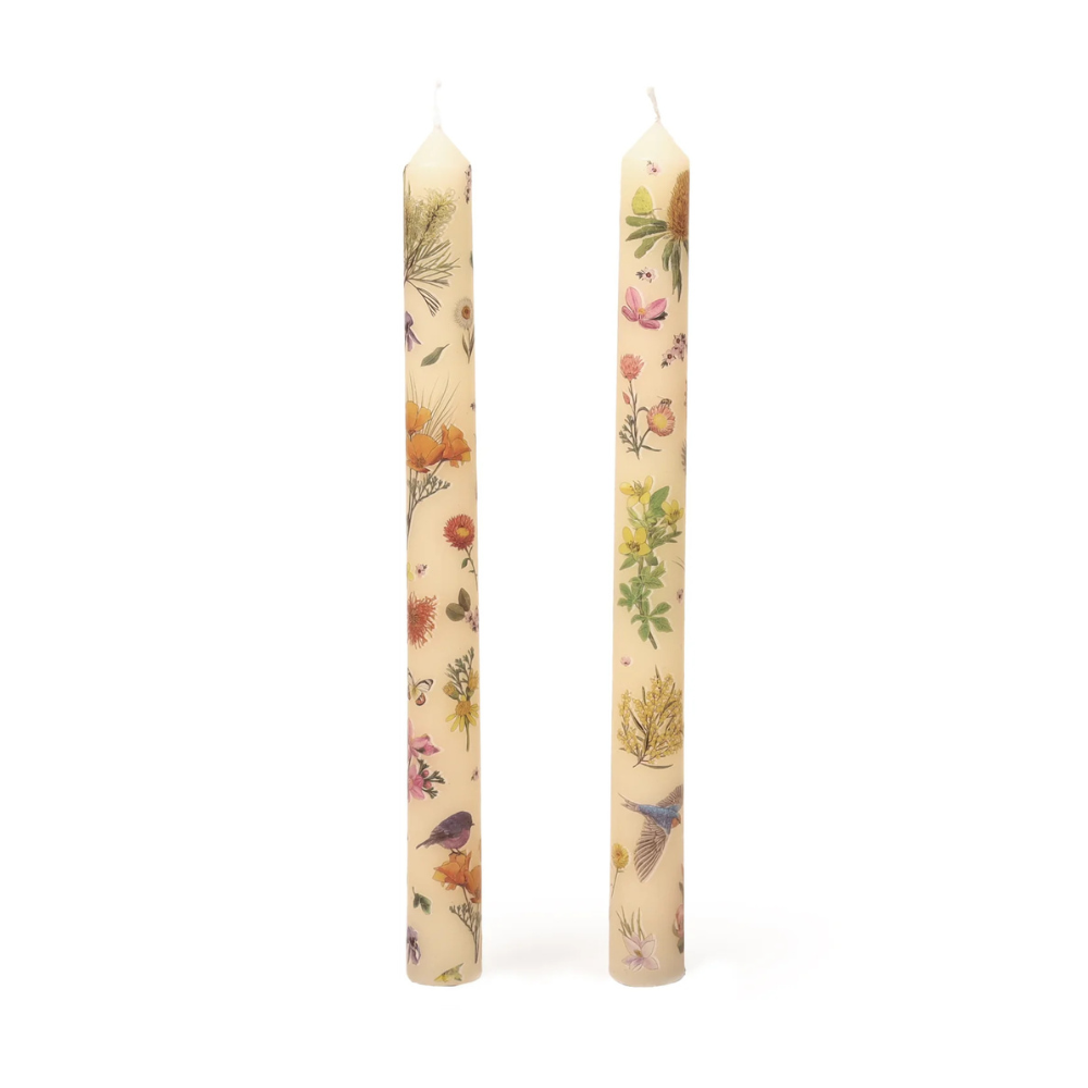 Our Beautifully Illustrated Dinner Candles are made from paraffin wax and feature a braided cotton wick. Unscented and lead-free, each candle stands 25cm tall and 2 cm wide, providing up to 6 hours of warm ambience.