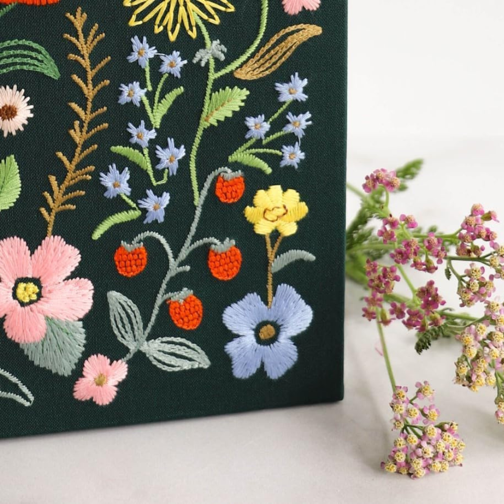 Our new embroidered sketchbook is a large, hardcover journal with 108 unlined pages of thick paper perfect for sketching, drawing, and journaling. The cover is wrapped in dark green book cloth and embroidered with our Strawberry Fields florals, and an attached grosgrain ribbon bookmark will save your place.