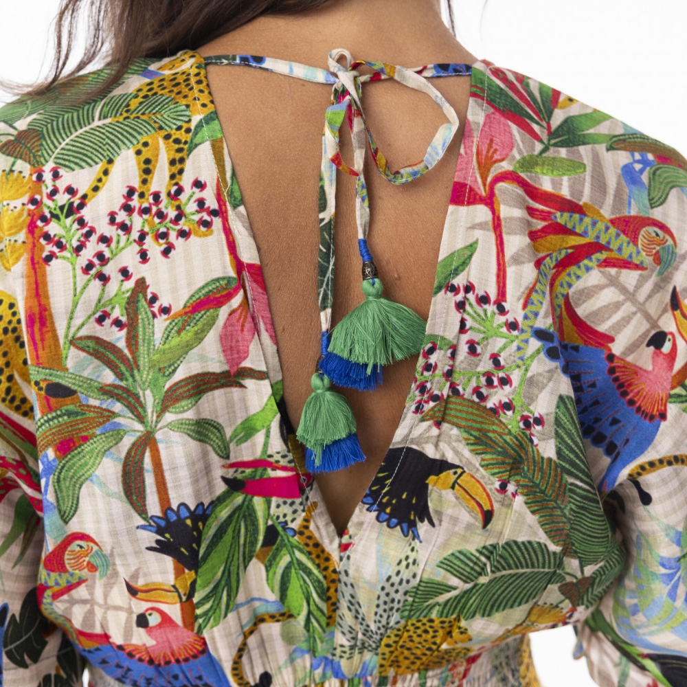 Begin your next chapter with the story-woven Dani Shirred Waist Dress. Featuring Amazonian flora and fauna print, the dress flows elegantly and accentuates feminine form with its masterfully crafted shirred waistline and while the kimono sleeve adds a touch of drama to this exceptionally unique dress.