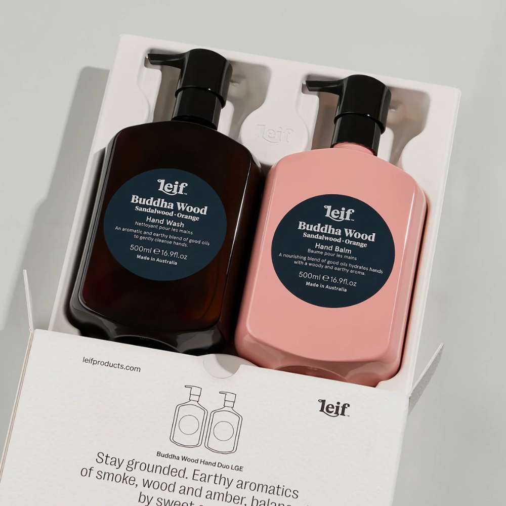 Deeply aromatic Buddha Wood Hand Wash & Balm 500mL is reimagined with the conceptual artwork of Sydney-based artist Mark Gowing.