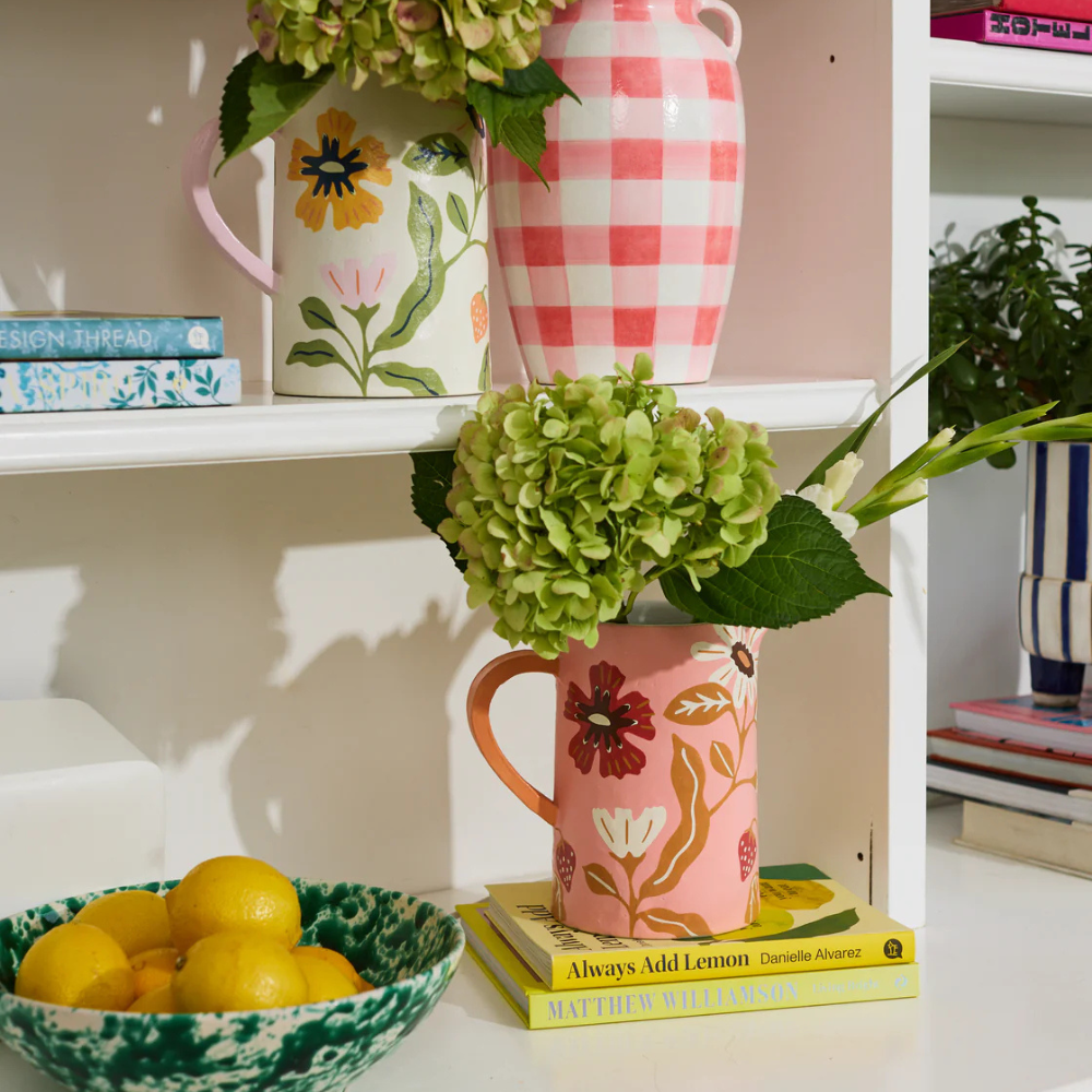 Our Meadow Jug in white creates a natural canvas for hand-painted wildflowers, strawberries, and verdant stems each brushstroke applied by our partners in Santo Tomas, Philippines. This wheel-thrown statement piece with its warm terracotta handle brings folk-inspired botanical charm to shelves and sideboards. Not a precious object but a generous companion for daily living, its slight variations in brushwork evidence of the human touch.