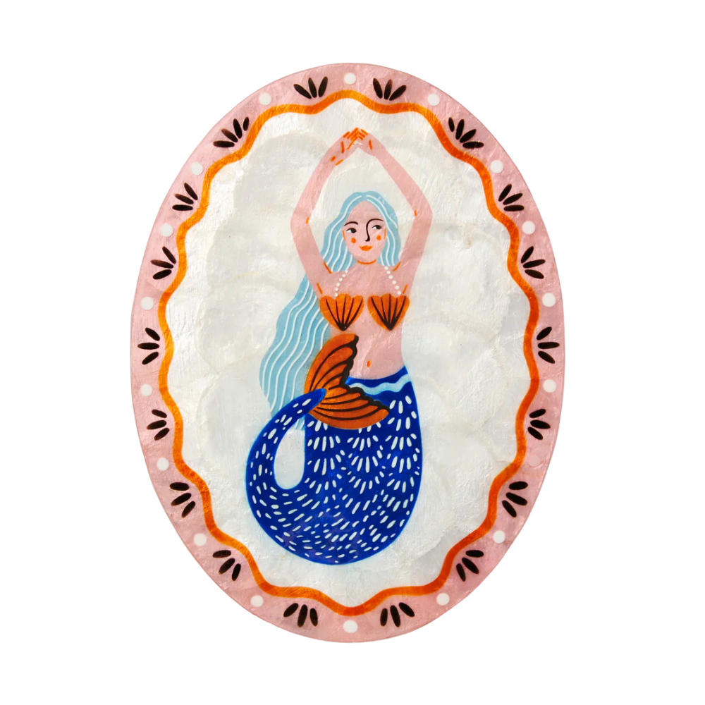 Luminous Capiz shell meets artisanal brushwork in our Mermaid Pearl Fan Tile, where seafaring dreams soar on your wall. This pink and orange bordered oval showcases a flowing-haired mermaid with shimmering blue and white scales that captures both light and imagination. The subtle variations in shell opacity and painted technique transform ordinary walls into enchanting underwater narratives a statement piece that brings unexpected joy.