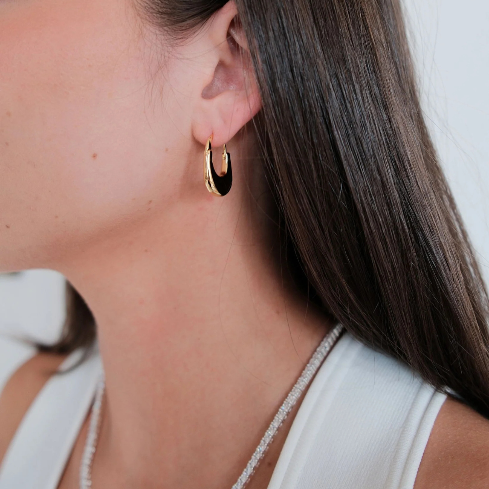 The Sienna Hoop is a modern classic with its smooth, sculptural silhouette and polished gold finish. Designed for effortless everyday wear, this bold yet minimal piece transitions seamlessly from casual styling to evening elegance. Wear solo for a clean statement or layer with delicate studs for a chic, stacked look.