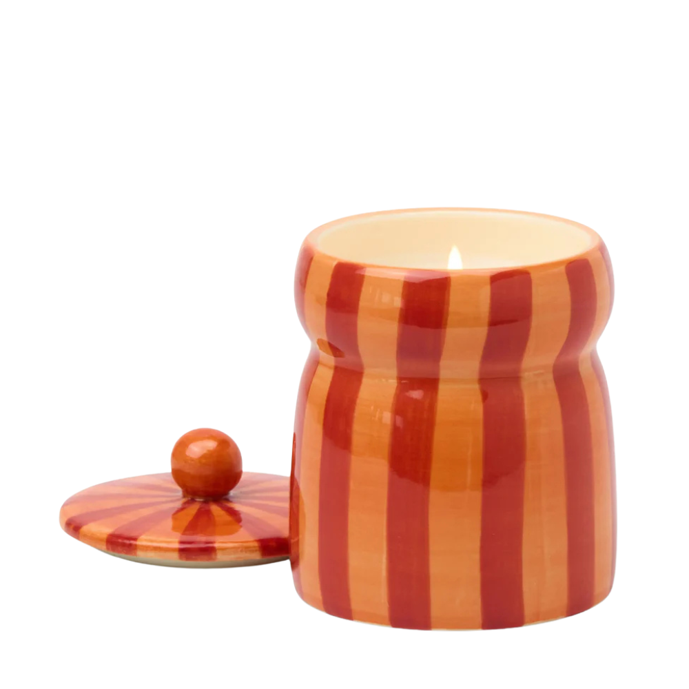 Bring home the holiday season with the Spiced Apple cabana ceramic candle. Housed in a hand-painted orange and red vessel with a matching lid, this festive candle blends crisp apple with warm spices for a cozy, nostalgic scent. Once the candle has finished, the lidded ceramic jar can be reused as a decorative container or storage piece.